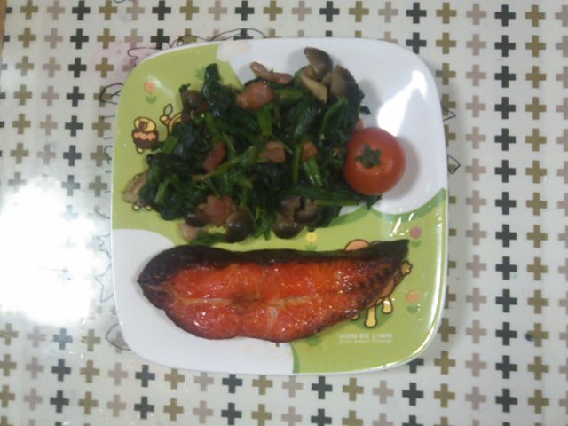 本日はカレイのみりん干しと、ほうれん草のベーコン入り炒め物です