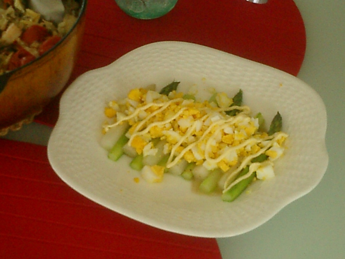 サラダはゆでたアスパラの上に、刻んだゆで卵とマヨがかかっているんだけど、