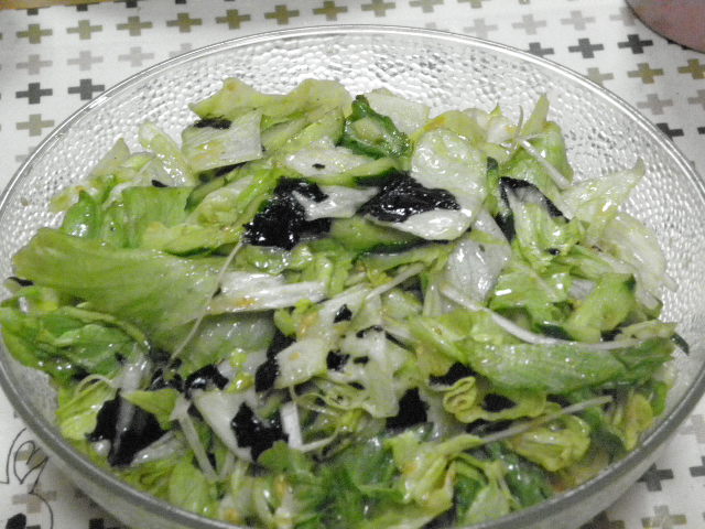 レタス・白髪ネギ・きゅうり・海苔をまぜてドレッシングであえました。