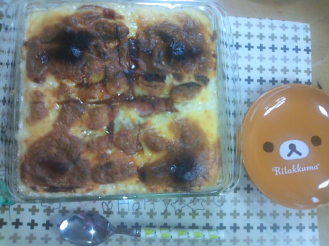 たまねぎと残りゴハンとをバターでいためて敷き詰めて、ソースとソーセージのスライスとチーズをのせて焼けばできあがり!